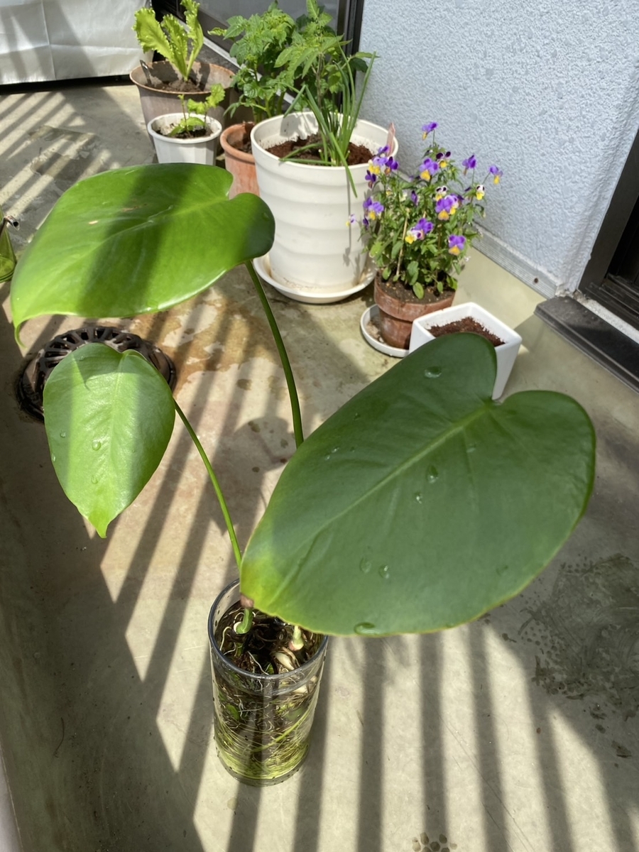 ただ、ちょうどいい鉢やスペースがなかったため、一時的にモンステラの瓶に同居してもらうことにしました。